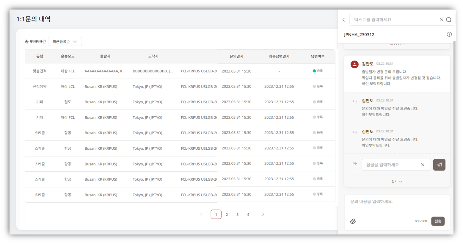서비스를 이용하는 동안 어느 화면에서도 바로 접근 가능한 1:1 담당자 문의 기능을 통해, 고객이 문제를 만난 모든 순간 담당자와 바로 연결되어 손쉽게 문제를 해결할 수 있습니다. 부킹 건별로 정리된 문의 내역과 지난 대화 내용 검색 기능을 통해 업무 효율을 극대화할 수 있습니다.