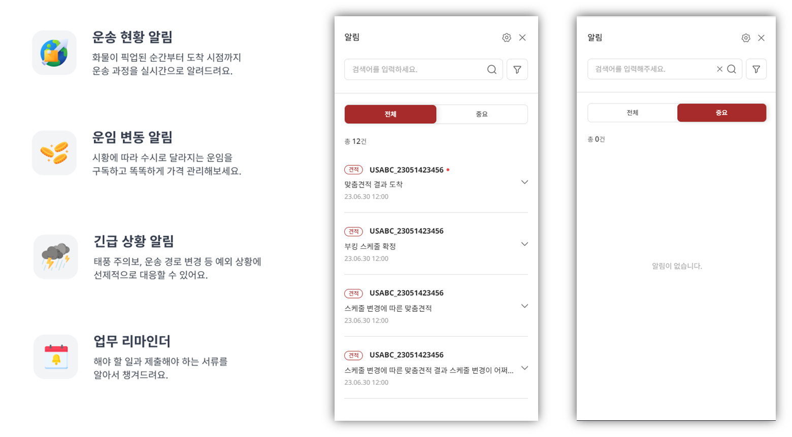 담당자가 부재중이더라도, 화주가 먼저 문의하지 않아도  PantosNow의 통합 알림 센터를 통해 나의 운송과 관련된 모든 알림을 실시간으로 받을 수 있습니다. 부킹 진행 과정, 운송 현황은 물론 운송 지연이나 운송 경로 변경 등 예외 상황에 대한 알림도 보내드립니다.